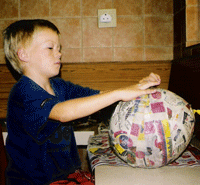5. When the flour glue has cooled adequately, carefully dip each strip of newspaper into it, wipe off the excess glue and wrap it around the balloon. 6. Cover the entire balloon with strips of paper and then place it in a safe place to dry overnight (or for about 8 hours). We stood ours in a plastic bowl. 7. Cover the balloon with two more layers of paper strips, allowing each layer to dry inbetween. 8. When the third layer has dried, using an atlas or globe as a guide, draw the continents on your globe with a pencil. 9. Place some newspaper on your worktop and paint the land and the seas. Use one color at a time. Variation of Earth Craft While doing this project you could do as we did and also make a papier maché piggy bank. 1.After covering your balloon with one layer of paper strips, add feet, ears and a nose cut from a cardboard egg carton and secure them with masking tape.